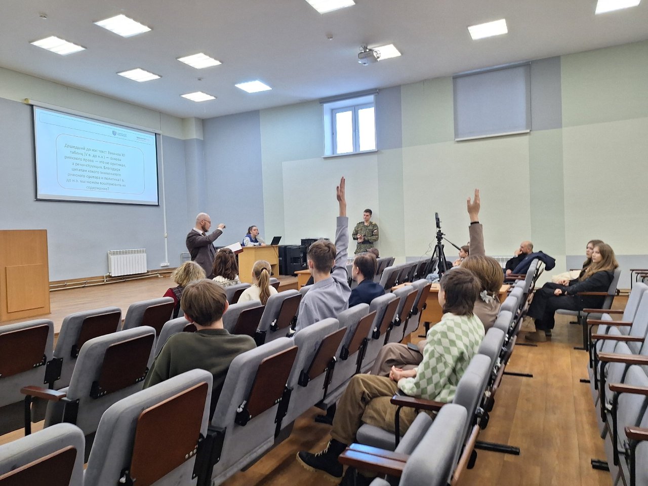 После того, как декан ответила на вопросы абитуриентов в свете грядущей приемной кампании 2026 года, Федор Сергеевич прочитал небольшую лекцию «Занимательная юриспруденция», вобравшую в себя интересные факты о творческом начале работы юриста. Ставшая уже традиционной викторина «Юридический эрудит» выявила талантливых абитуриентов, которые ушли домой не с пустыми руками: мы щедро вручали сувениры с университетским брендом.