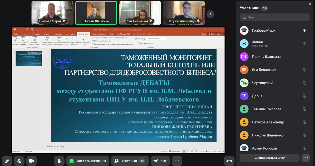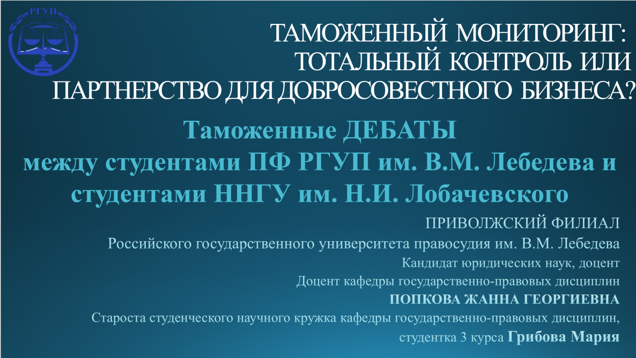 10 ноября состоялось совместное заседание научных кружков кафедры административного и финансового права юридического факультета ННГУ им. Н.И. Лобачевского и кафедры государственно-правовых дисциплин Приволжского филиала РГУП им. В.М. Лебедева в форме дискуссионной площадки по таможенному праву на тему: «Таможенный мониторинг: тотальный контроль или партнерство для добросовестного бизнеса?».