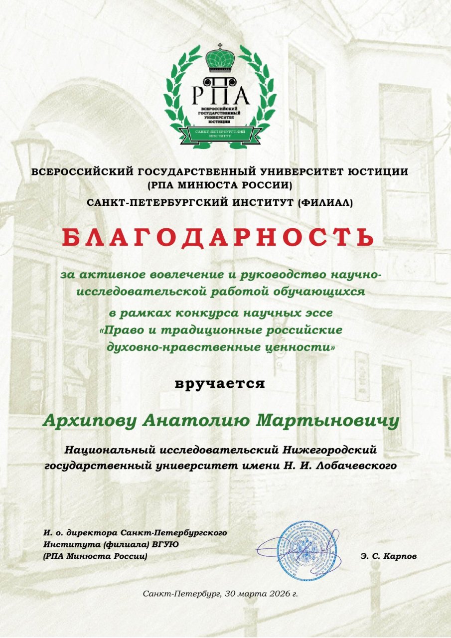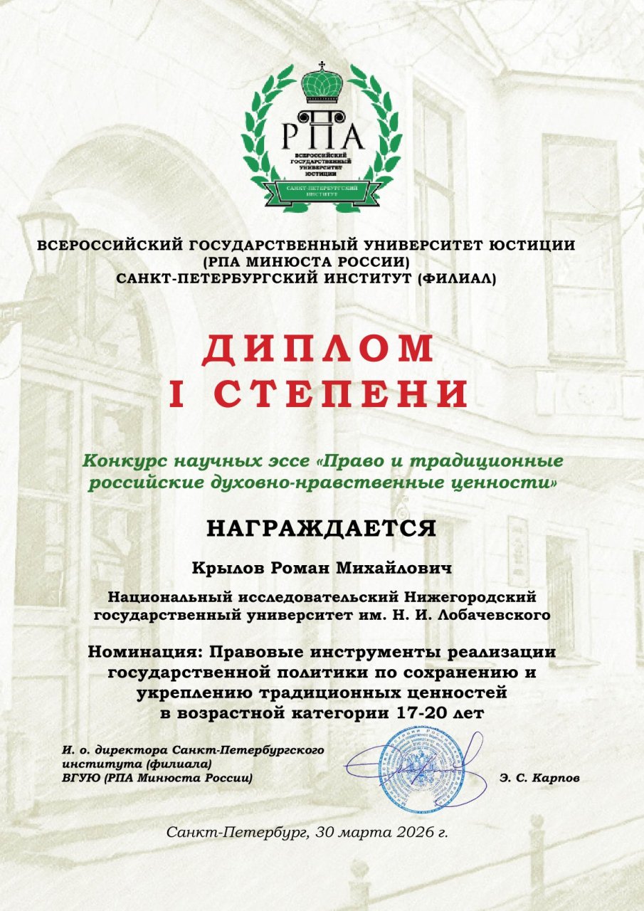 Студент юридического факультета Национального исследовательского Нижегородского государственного университета им. Н.И. Лобачевского (ННГУ) Роман Михайлович Крылов удостоен диплома I степени, а его научный руководитель — доцент Анатолий Мартынович Архипов — получил благодарность за активное вовлечение и руководство научно-исследовательской работой обучающихся.