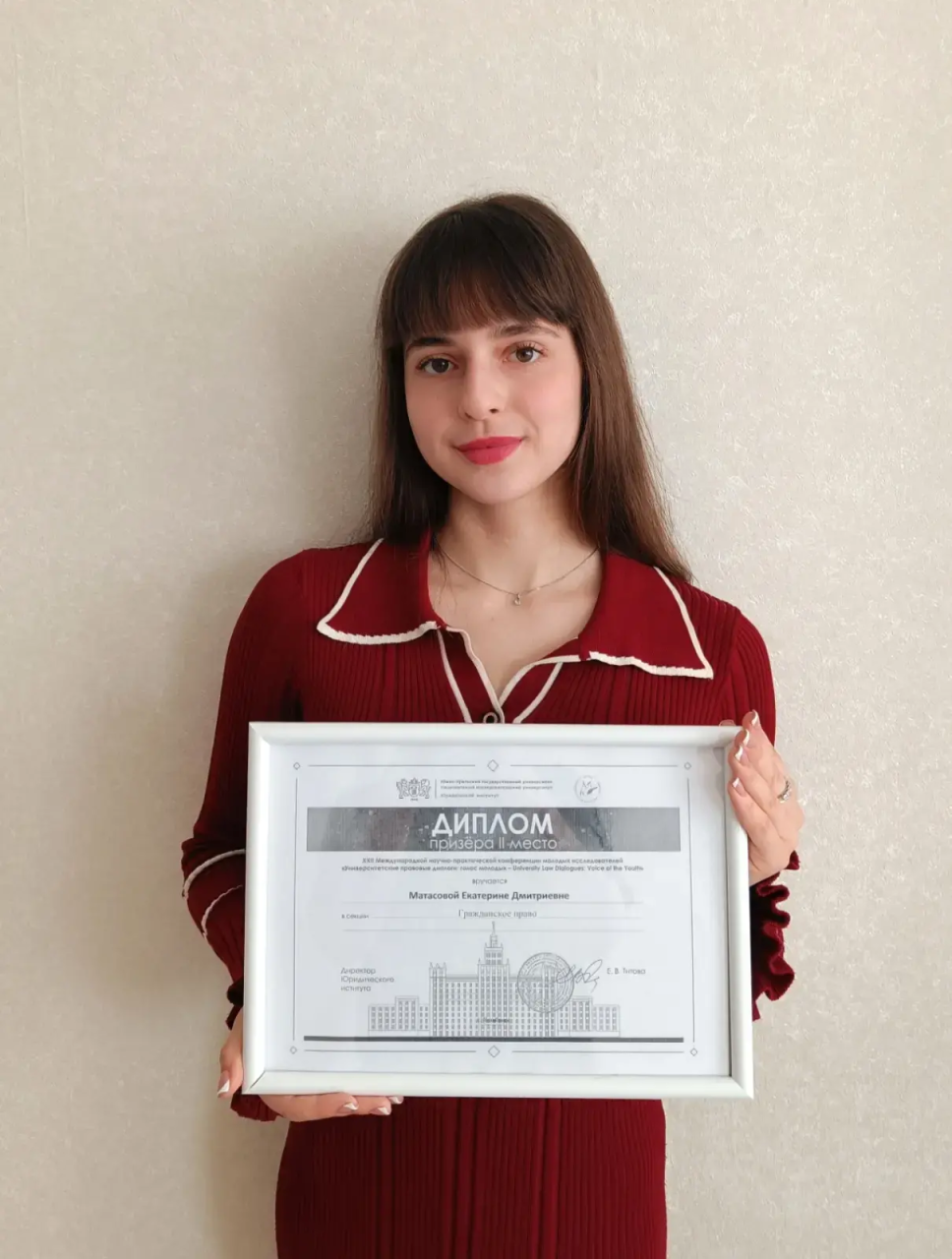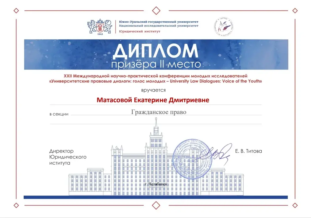 Студентка 2-го курса юридического факультета Екатерина Матасова представила юридический факультет ННГУ им. Н.И. Лобачевского на XXII Международной научно-практической конференции молодых исследователей «Университетские правовые диалоги: голос молодых — University Law Dialogues: Voice of the Youth» (г. Челябинск).